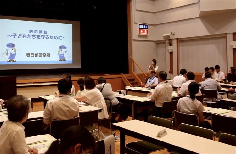 単位PTA会長と校長先生・教頭先生が参加した会長研修会では、はじめに春日部警察署生活安全課から講師をお招きし、「子どもたちを守るために」というテーマで講演会を行いました。その後は、8グループに分かれ『「こどもかけこみ110番の家事業」を含めた安全活動の取り組みについて』というテーマで情報交換会を行いました。